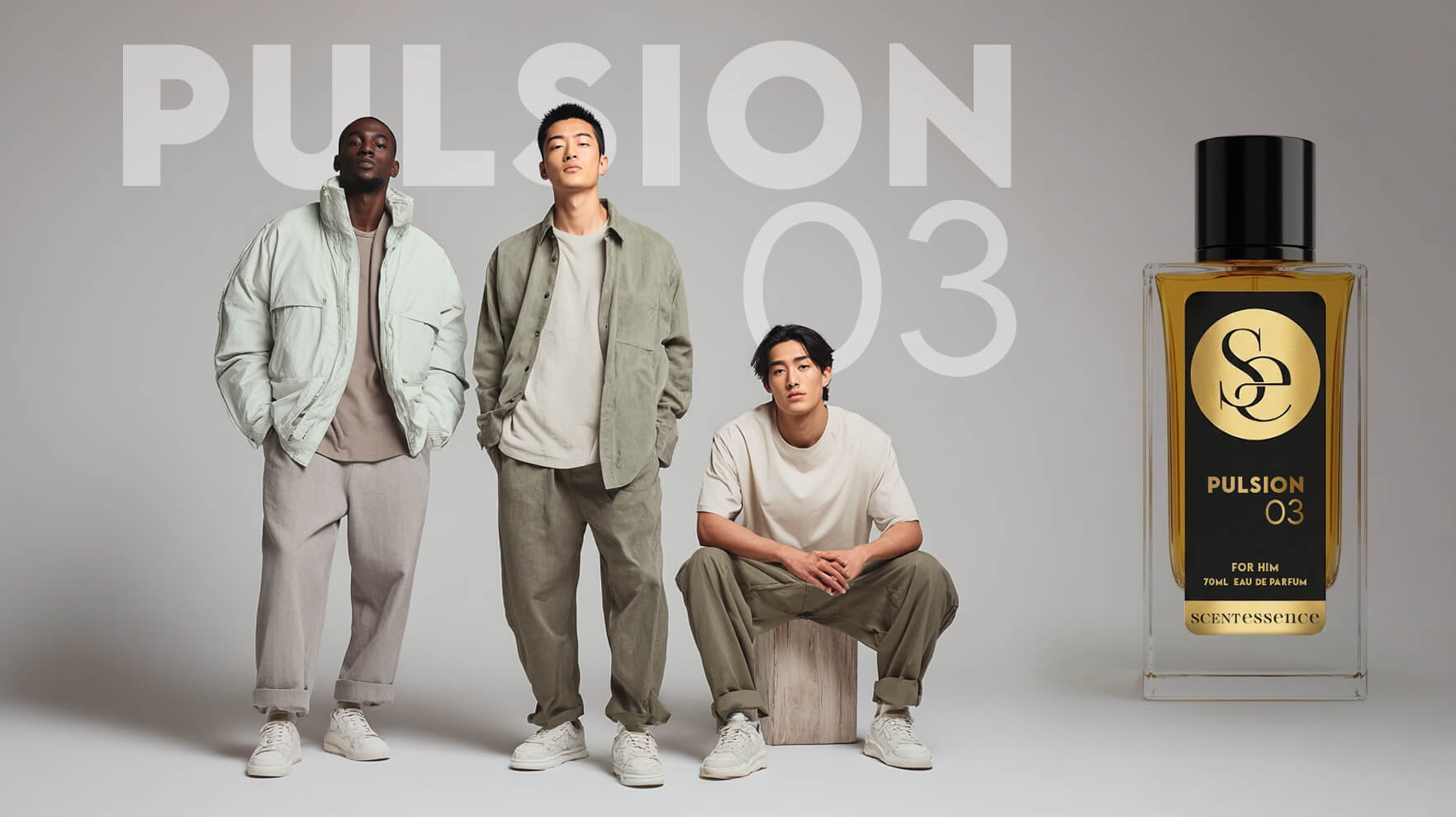 PULSION 03 is driven by movement and momentum. Fresh yet powerful, it captures confidence in motion energetic, clean, and irresistibly masculine.